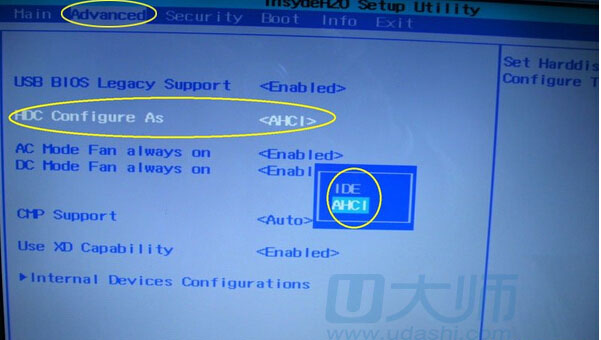 2.重启电脑,在出现开机画面时按快捷键进入bios(bios快捷键再开机画面时均有提示,如果没有可以上网查询自己电脑主板的bios快捷键),进入bios后,按方向键左右,选择“Advanced”,再按方向键上下,选择“HDC Configure As”,接着按回车键,使上下方向键选择“AHCI”再按回车,然后按F10保存退出即可: