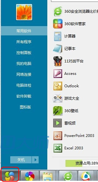 如果对win8系统的开始菜单实在喜欢不起来,那么小编就建议大家通过第三方软件(例如360,win8优化大师),添加一个任务栏的开始菜单。下图就是小编用360添加的“开始”按钮,与win7的“开始”按钮较为相似: