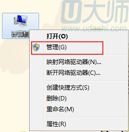 1.在桌面上右键单击“计算机”图标,选择“管理”: