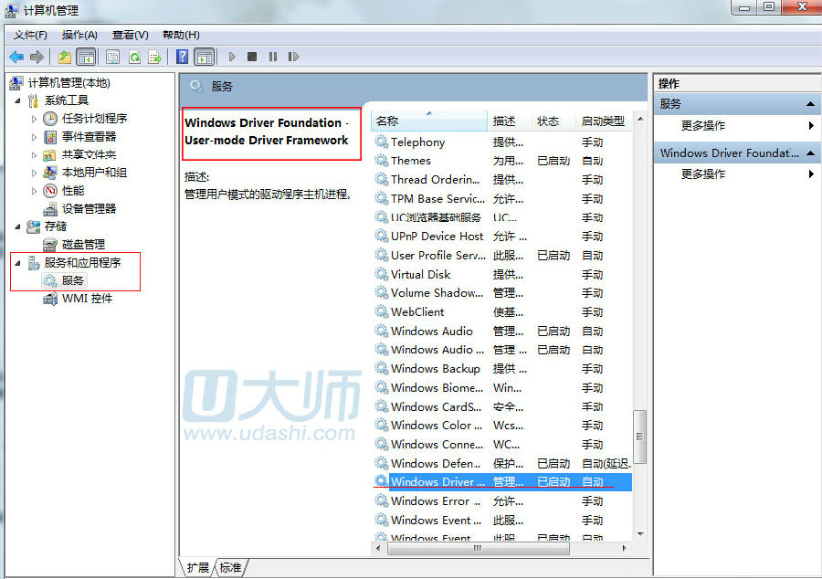 2.弹出的窗口中依次打开“服务和应用程序--服务”,在右侧的列表中选择“Windows Driver Foundation-User-mode Driver Framework”,然后将其打开: