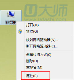 1.在桌面右键单击“计算机”图标,在弹出的菜单中选择“属性”: