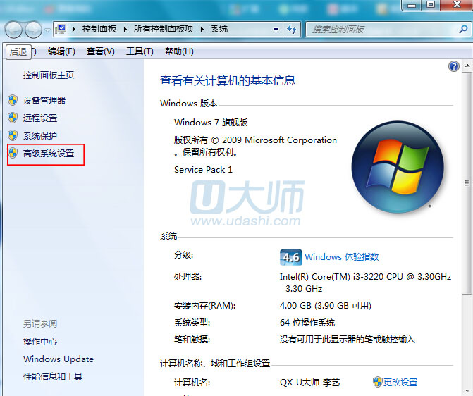 2.在打开的系统页面中,在左上方点击“高级系统设置”,弹出“系统属性”窗口,选择“高级”选项卡,点击“设置”: