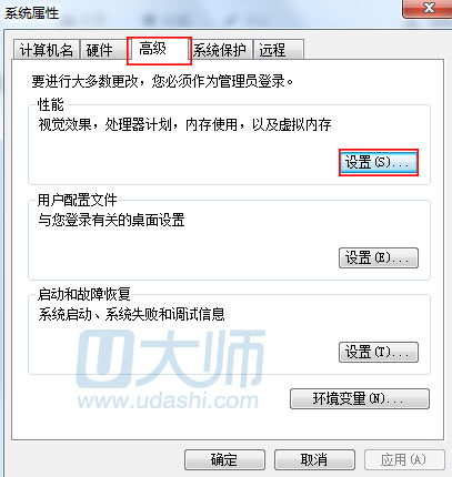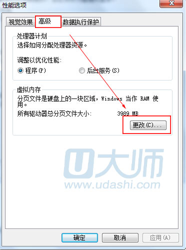 3.点击“设置”后出现“性能选项”对话框,选择“高级”选项卡,点击“更改”按钮: