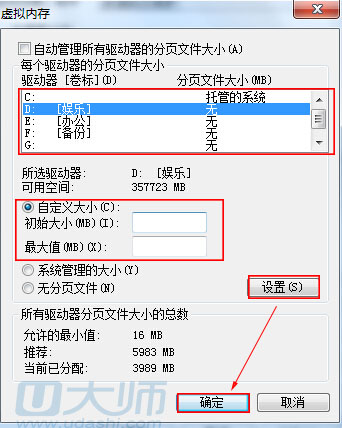 4.点击“更改”按钮后,打开了“虚拟内存”对话框,小编以D盘为例,在驱动器选择D盘,然后点击自定义大小,接着就可以设置初始大小和大值(小编建议虚拟内存设置多少要根据实际情况不要设置的太大,太大就浪费磁盘空间了,一般也不需要那么大的虚拟内存,所以一般2G到4G就够用了):