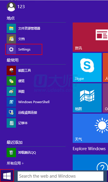 1.在win10系统的开始菜单中,找到“Settings”设置:
