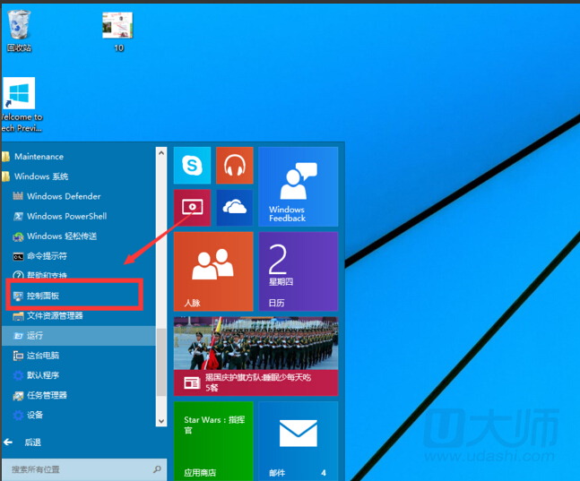 1.点击“windows图标”,然后在所有应用找到“控制面板”: