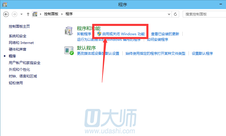 3.在程序窗口找到并点击“启动或关闭windows功能”: