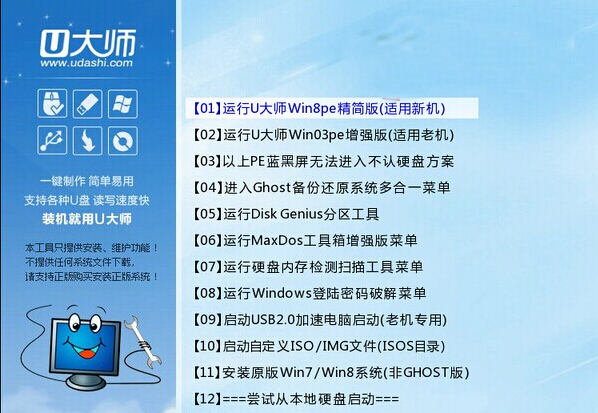 3.选择好启动项后只需要回车键确认,电脑便会从u盘启动进入u大师的主菜单界面: