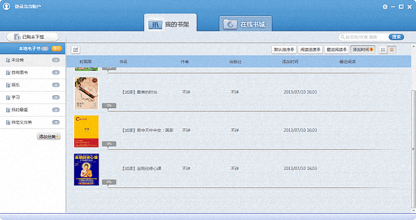 当当读书是一款由当当网推出的电子阅读软件,支持在线下载、本地收藏、离线阅读、离线编辑等多种功能,包括我的书架和在线书城两大模块,用户可以按照图书类型进行分类,例如娱乐、学习、小说、杂志、自定义分类等。