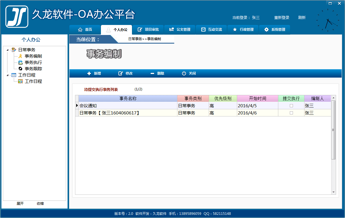 1 待办事项:系统将当前登录用户所有待办事务以列表的形式显示并统计出来。通过这里可以快速进入相关模块,及时处理相关事宜