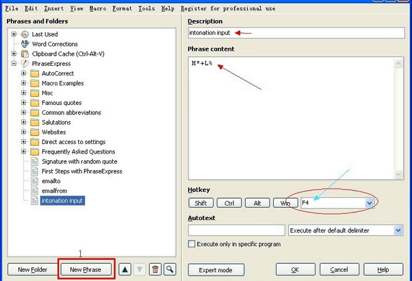 3、如果您想要输入H*+L%文本,以F4为快捷键,只需要在右下角图标中点击鼠标右键选择Edit Phrases,在出现的对话框里先点New Phrase,然后右侧输入description一项任意,主要输入内容和选择快捷键。