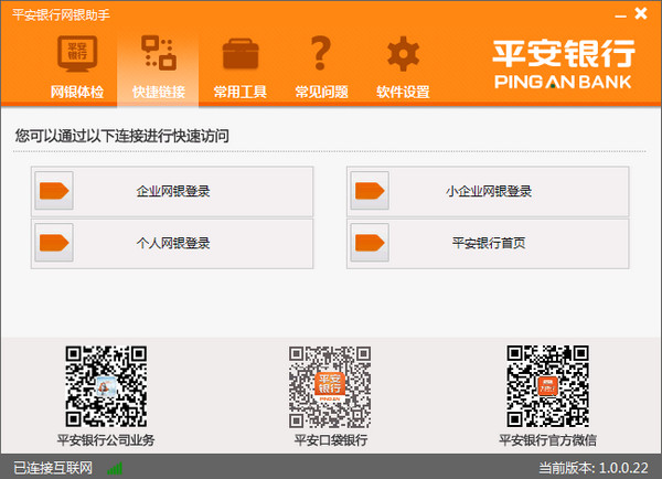 平安银行网上银行助手是集合了网银登陆、软件检测、多功能插件于一身的综合型软件。他能够检测你的电脑,判断你的电脑有没有阻碍运行平安银行相关插件的隐患。你能还能够直接从软件登陆你的网银窗口,不再需要打开繁琐的网页。软件还提供一些使用的小工具,以及常见问题解决。