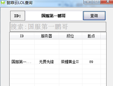 懿菲云LOL查询软件是一款专门为LOL游戏设计的辅助工具,可以帮你轻松查询玩家信息,界面简洁直观,使用方便,只需要输入玩家ID,然后点击查询,软件就会将所有符合条件的信息列举出来,简单实用。