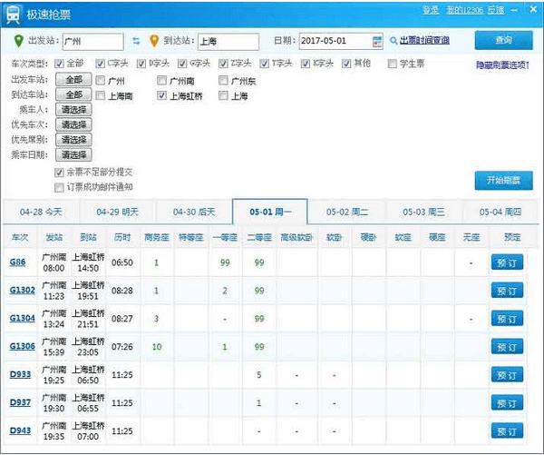 极速抢票操作简单,自动选择速度快服务器,抢票效果好,支持自动识别验证码、自动刷票、刷票成功后邮件通知。