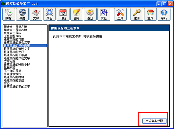 拥有时间特效、文字特效、图像处理、鼠标特效、页面特效、菜单特效、在线游戏、其它特效在内的八类上百个精彩特效;
